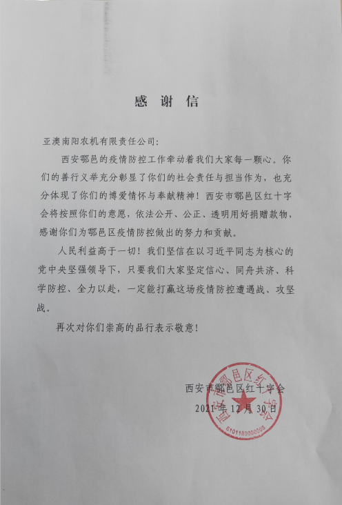 十二月份,一場(chǎng)突如其來的疫情打亂了西安人平靜的生活,面對(duì)日趨嚴(yán)峻的疫情態(tài)勢(shì),亞澳農(nóng)機(jī)作為一家有社會(huì)責(zé)任感的企業(yè)積極奉獻(xiàn)自己力量,亞澳農(nóng)機(jī)南陽公司為鄠邑區(qū)紅十字會(huì)捐款100000元,亞澳農(nóng)機(jī)總公司為鄠邑區(qū)甘亭街道東韓村捐款40000元,亞澳農(nóng)機(jī)與社會(huì)各界人士并肩作戰(zhàn),為疫情防控工作貢獻(xiàn)自己的一份薄力。