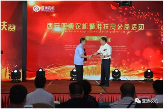 亞澳精準扶貧公益活動現(xiàn)場,中國農機化協(xié)會會長劉憲到會致辭,并給予亞澳頒發(fā)證書。
