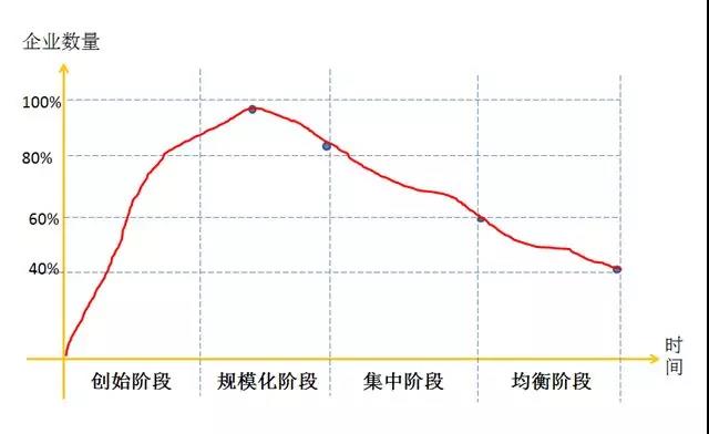 在一個行業(yè),從長期看,企業(yè)要存活下來就要有超出平均水平的成本控制能力。管理學(xué)家陳春花認為一個行業(yè)內(nèi)企業(yè)數(shù)量和時間軸之間的關(guān)系可以通過四個發(fā)展階段來說明:初創(chuàng)階段、規(guī)?;A段企業(yè)數(shù)量一直上升,規(guī)?;笃谄髽I(yè)數(shù)量達到頂峰,開始有擠出效應(yīng),約20%企業(yè)出局,到集中階段又有20%企業(yè)出局,到均衡階段還要淘汰20%,最后的競爭就在剩下的40%企業(yè)之間展開。